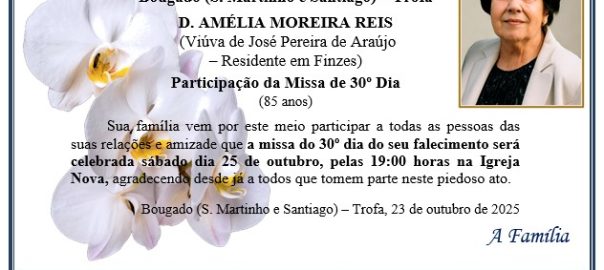 Missa de 30º dia: será celebrada sábado, dia 25 de outubro, pelas 19:00 horas na Igreja Nova.